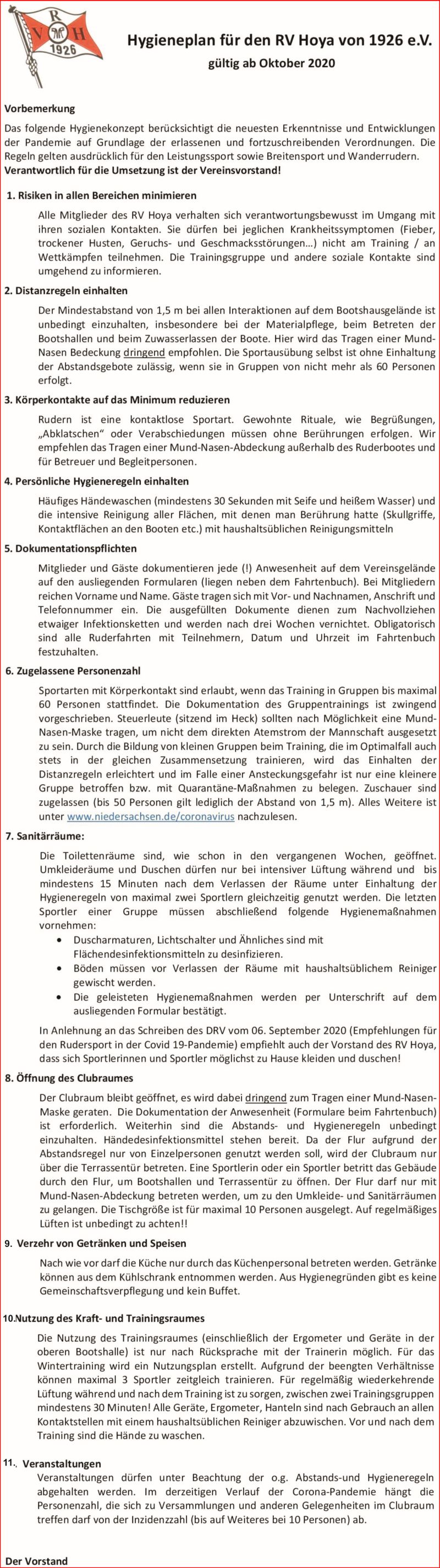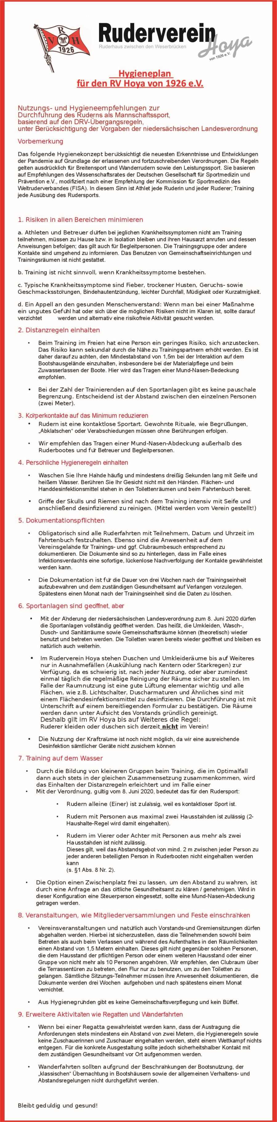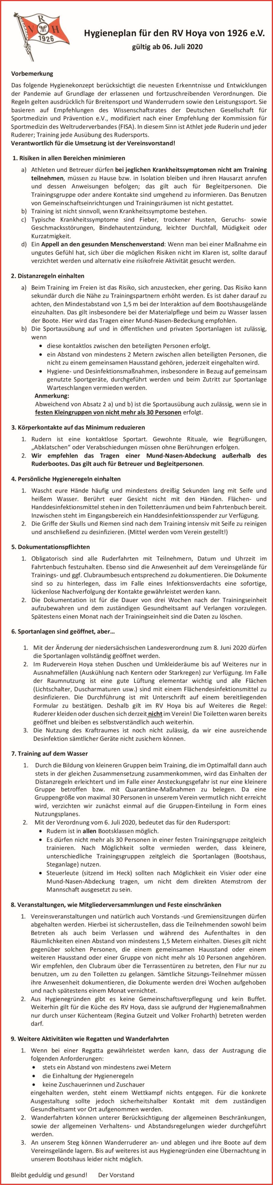 Hygieneplan des RV Hoya ab 06.07.2020